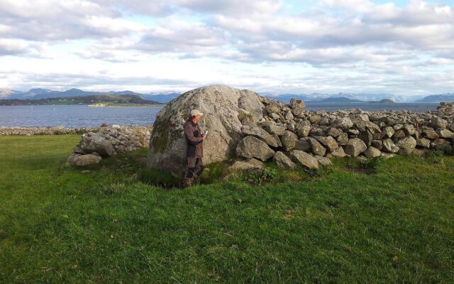 I stort steingjerde mellom innmark og beitemark nær sjøen helt Øst/Sør-Øst.