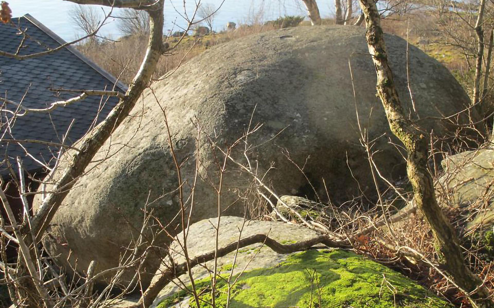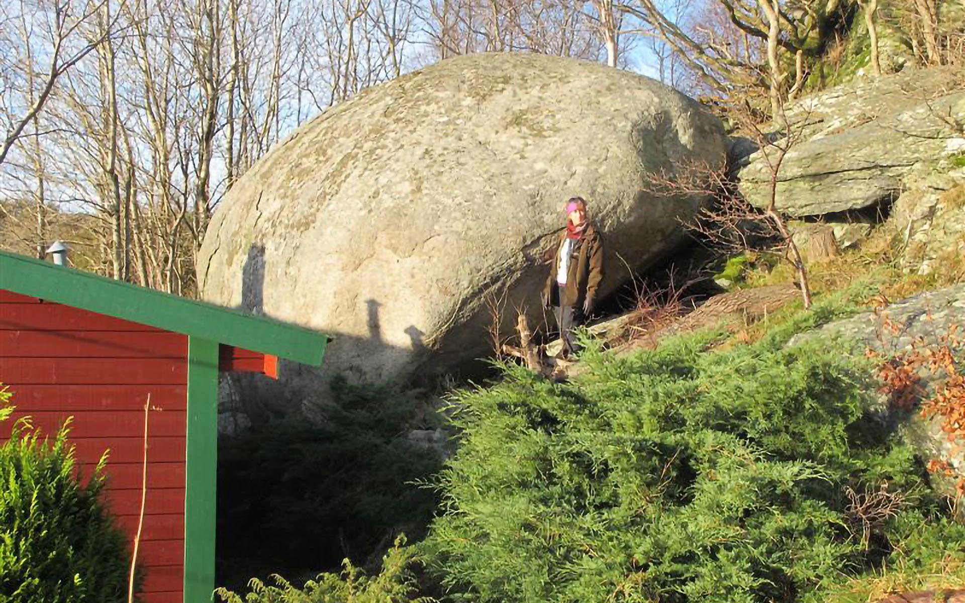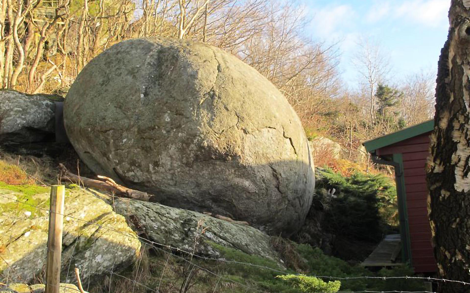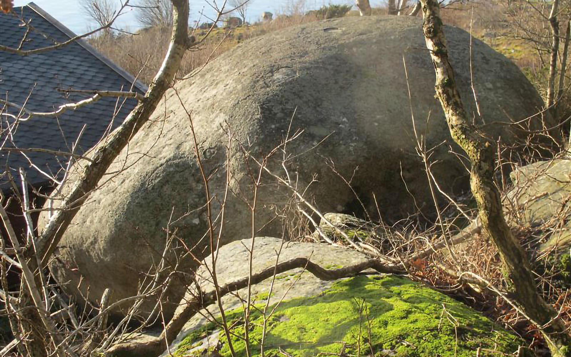 Stor stein ved Melingsjøvn, bak rød hytte ca 100m fra sjøen.