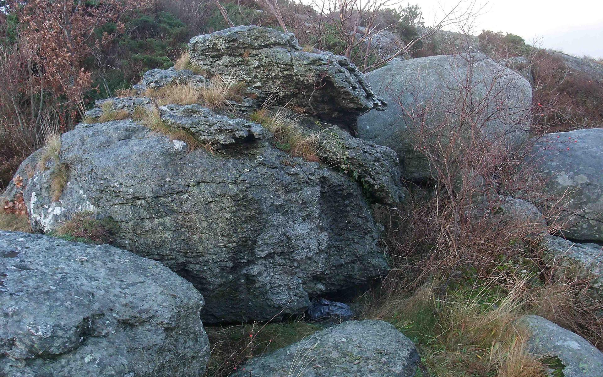 Oppsprukket fyllittblokk ti meter fra sjøen. Omtrent 3 meter høy og 10 meter i omkrets.