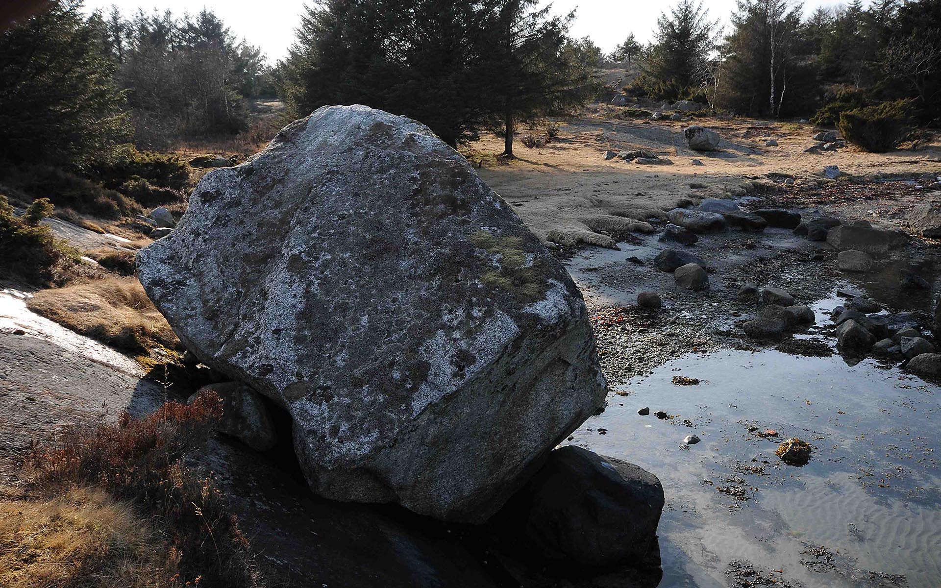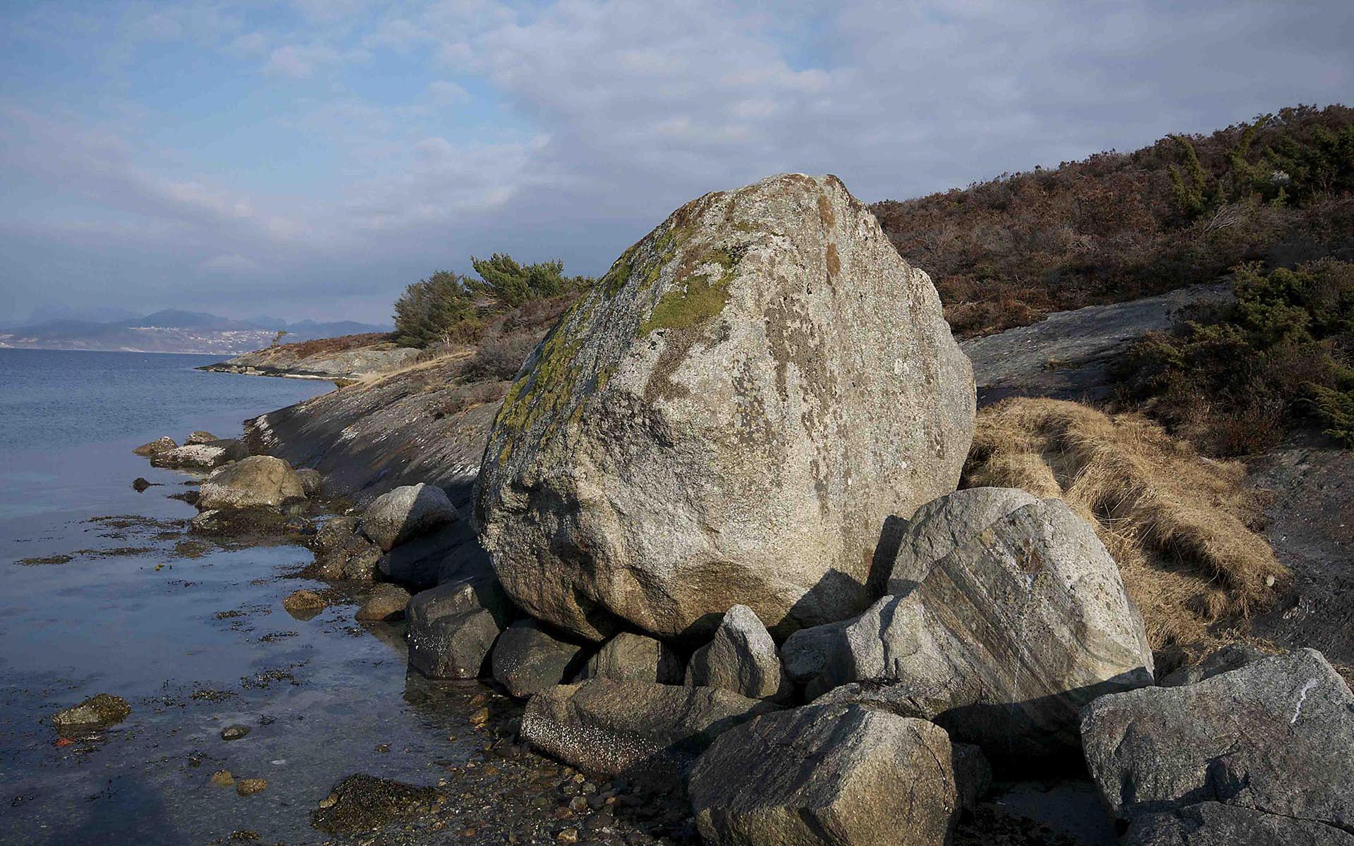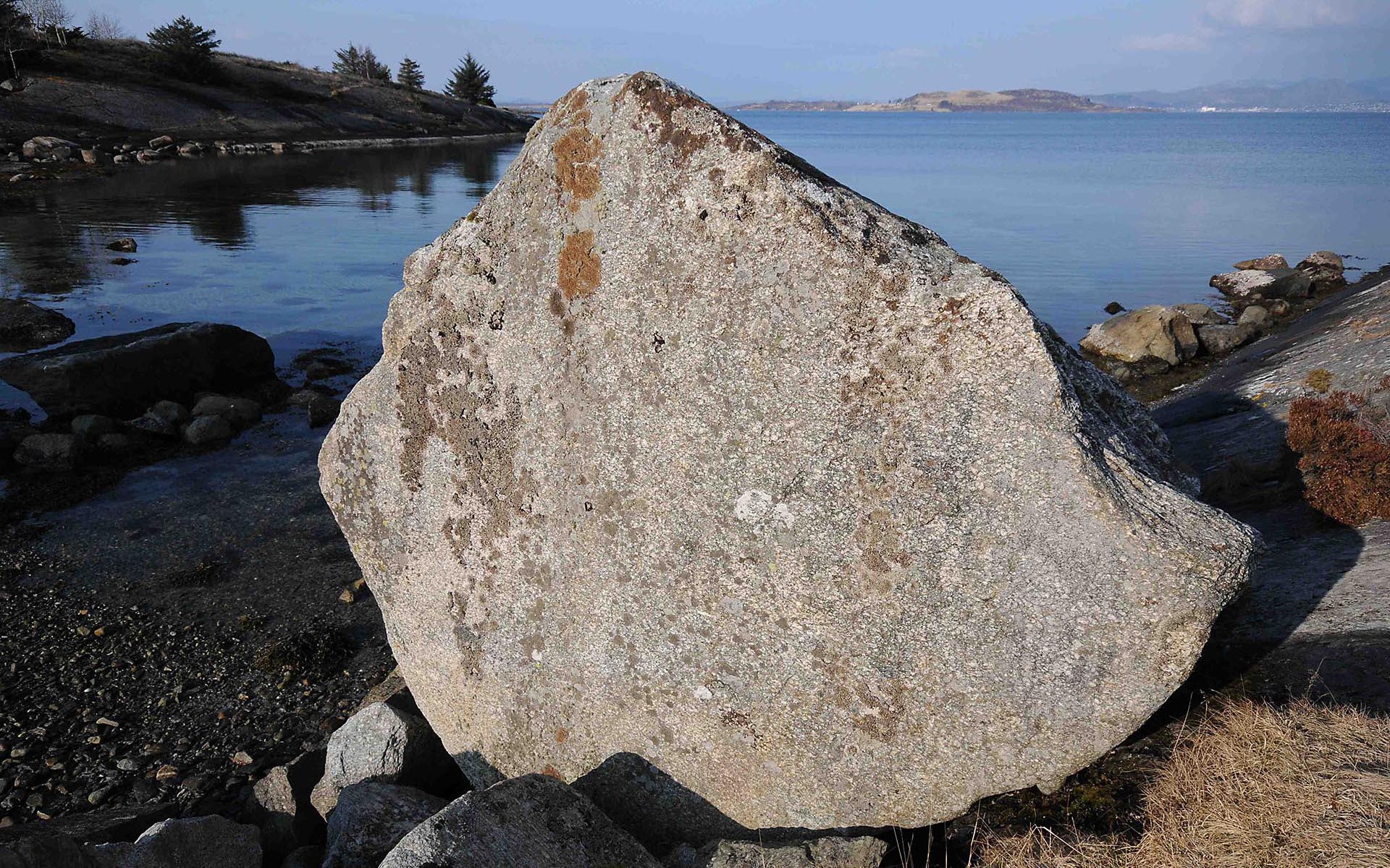 Granitt stein som ligger i sjøkanten. Omtrent 3 meter høy og 12 meter i omkrets.