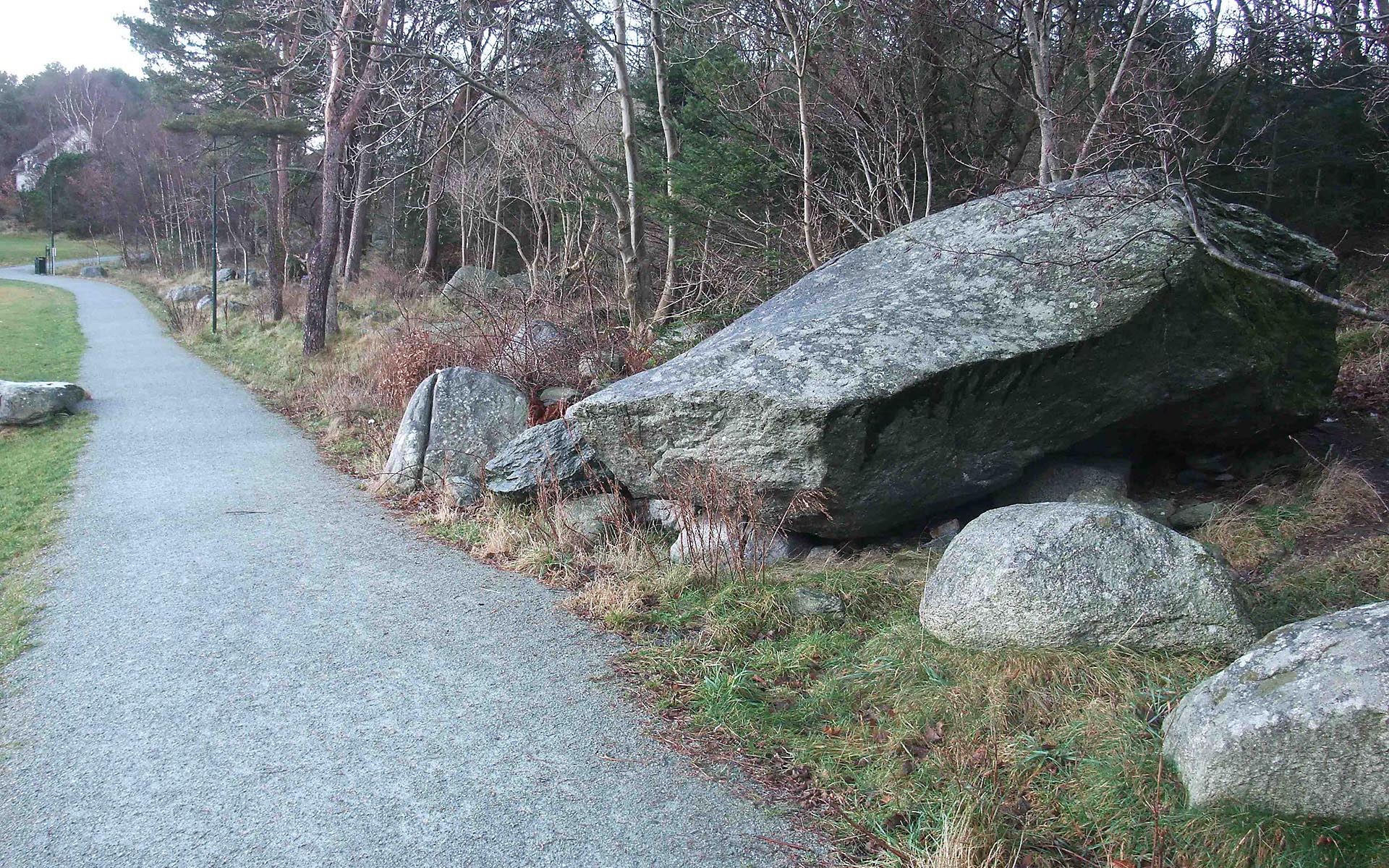Stor flat blokk like ved turstien. Omtrent 2,5 meter høy og 15 meter i omkrets.