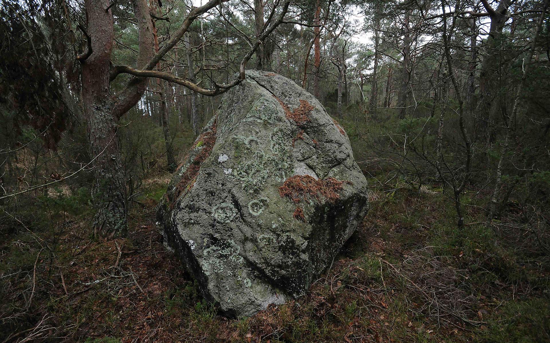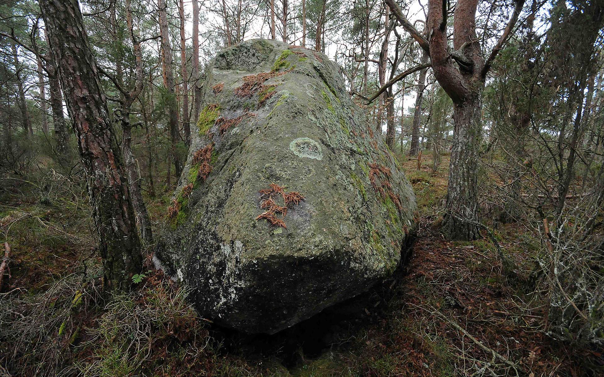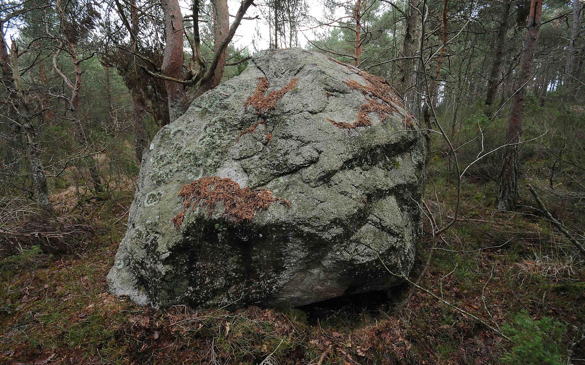 Sted: I tett furuskog ca midtveis mellom bukta i vest og sjøen i øst.
