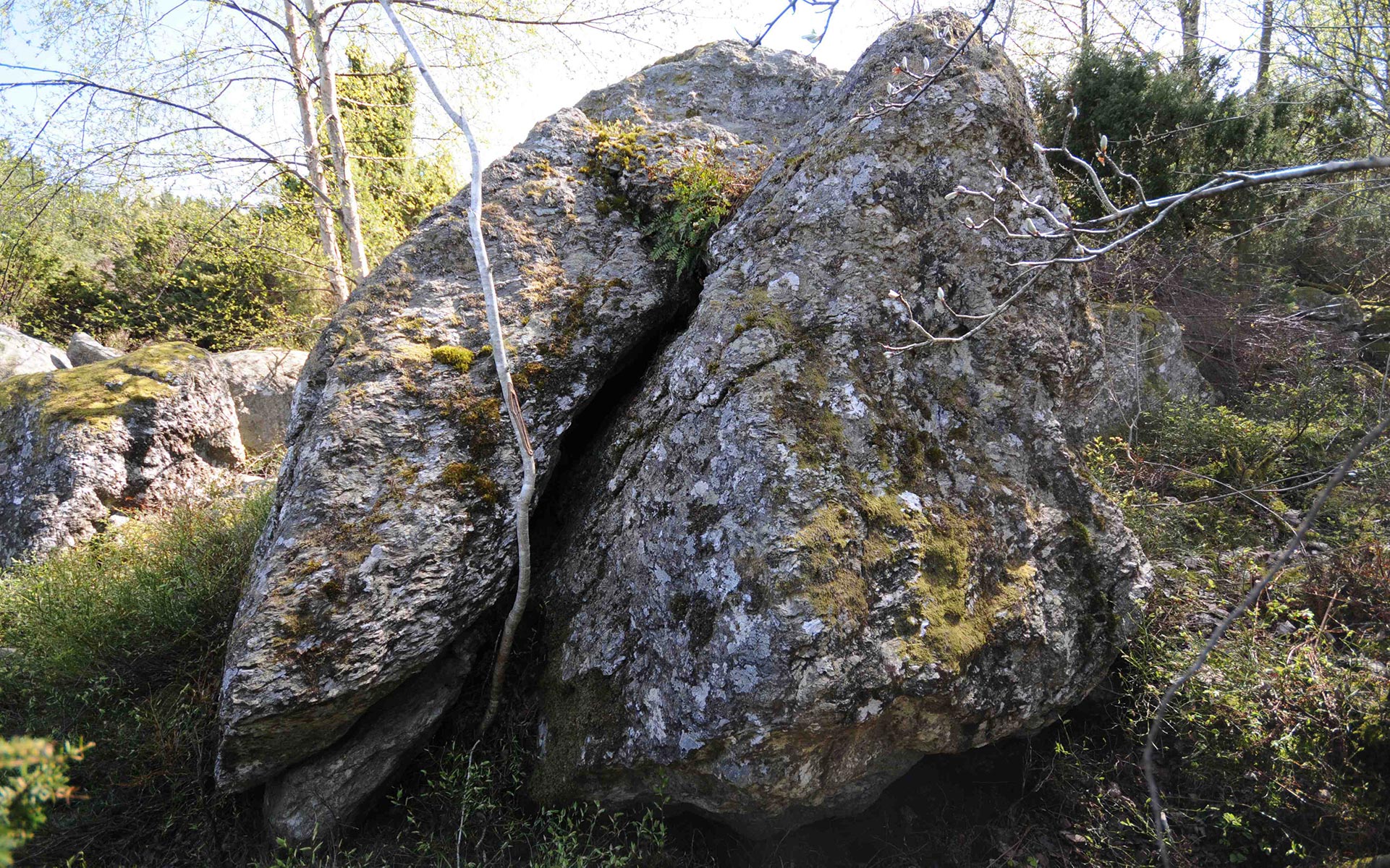 Særtrekk: Klovstein, kløyd i to nesten like store deler, pyrmaideform. Inngår i steingjerde.