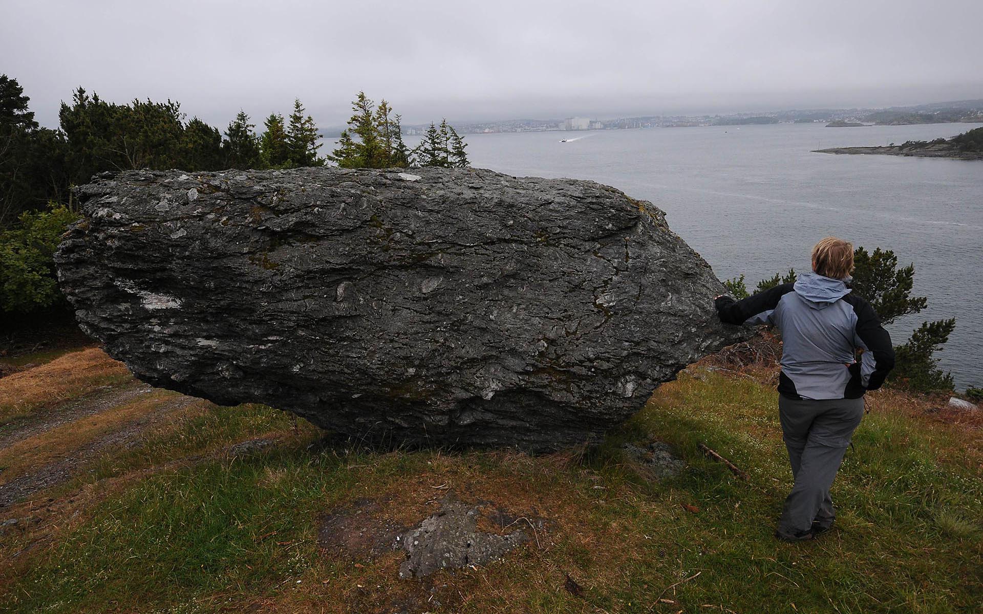 Sted: Steinen ligger på vestskråningen av Høgstahaug, like ved flaggstangen.