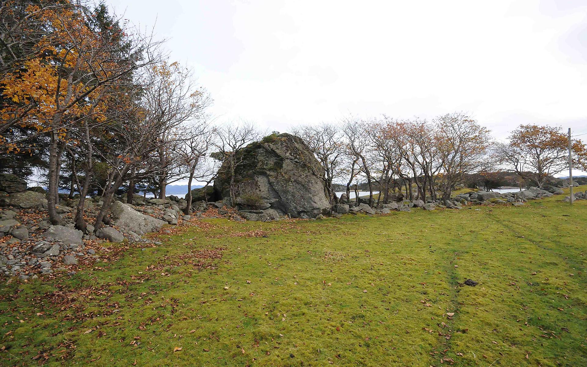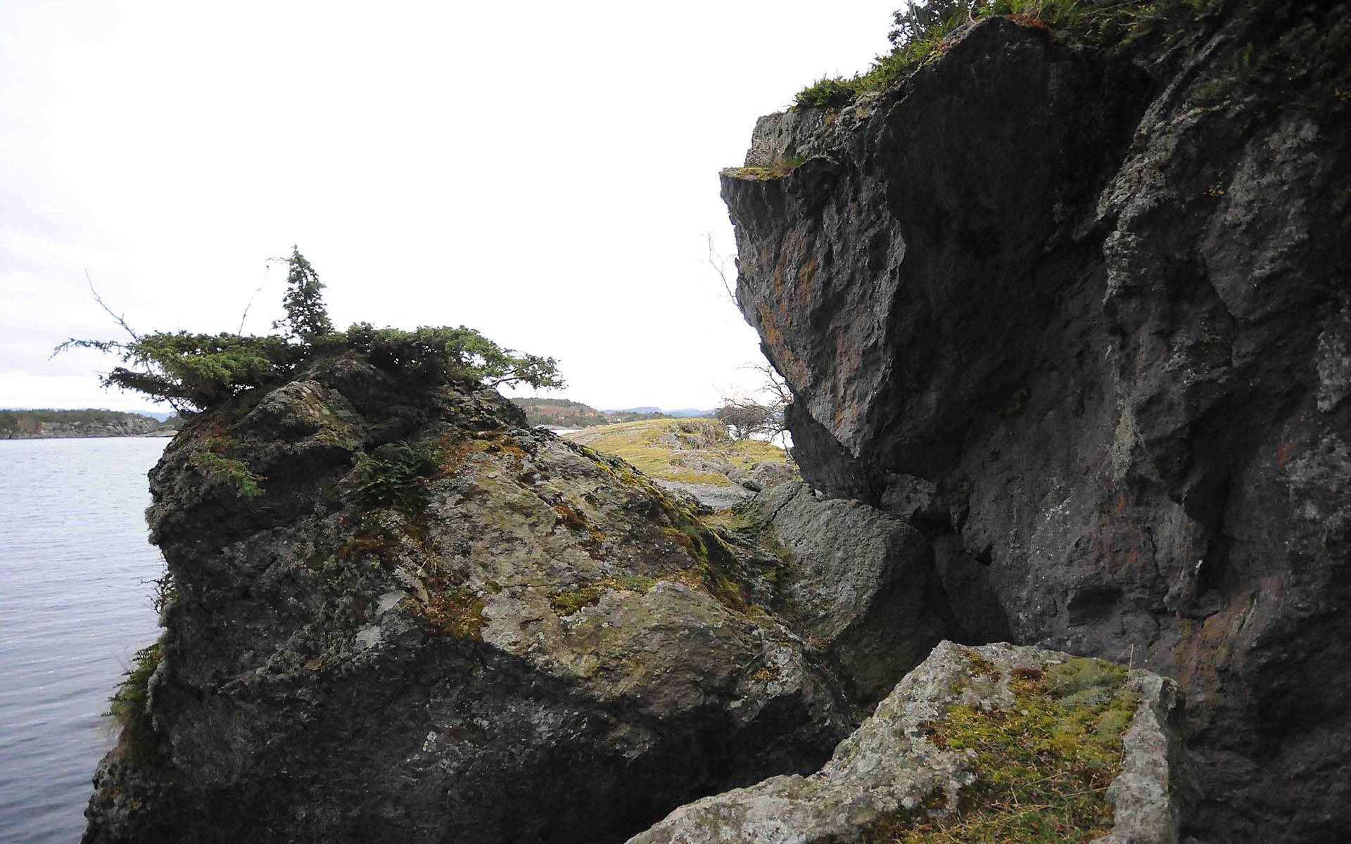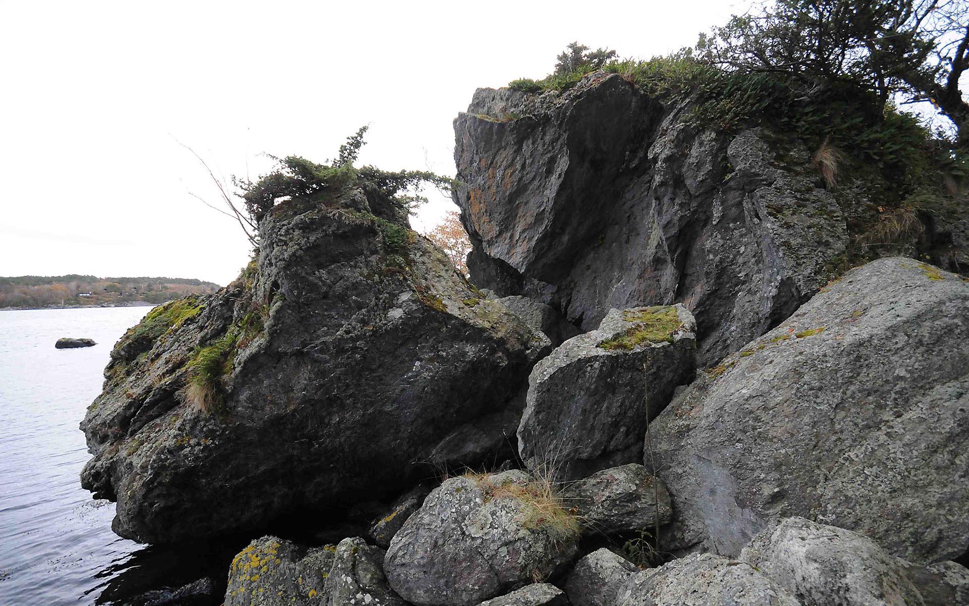 Særtrekk: En stor skalk av blokken har veltet ut i sjøen. Mye vegetasjon på blokken.
