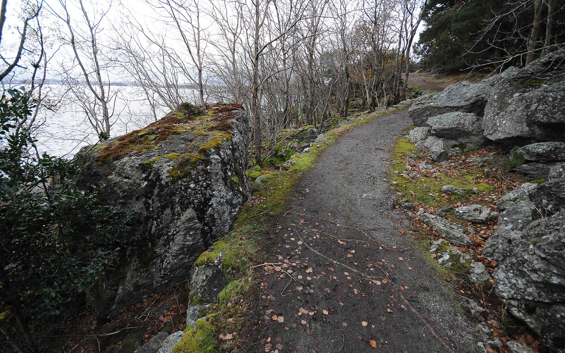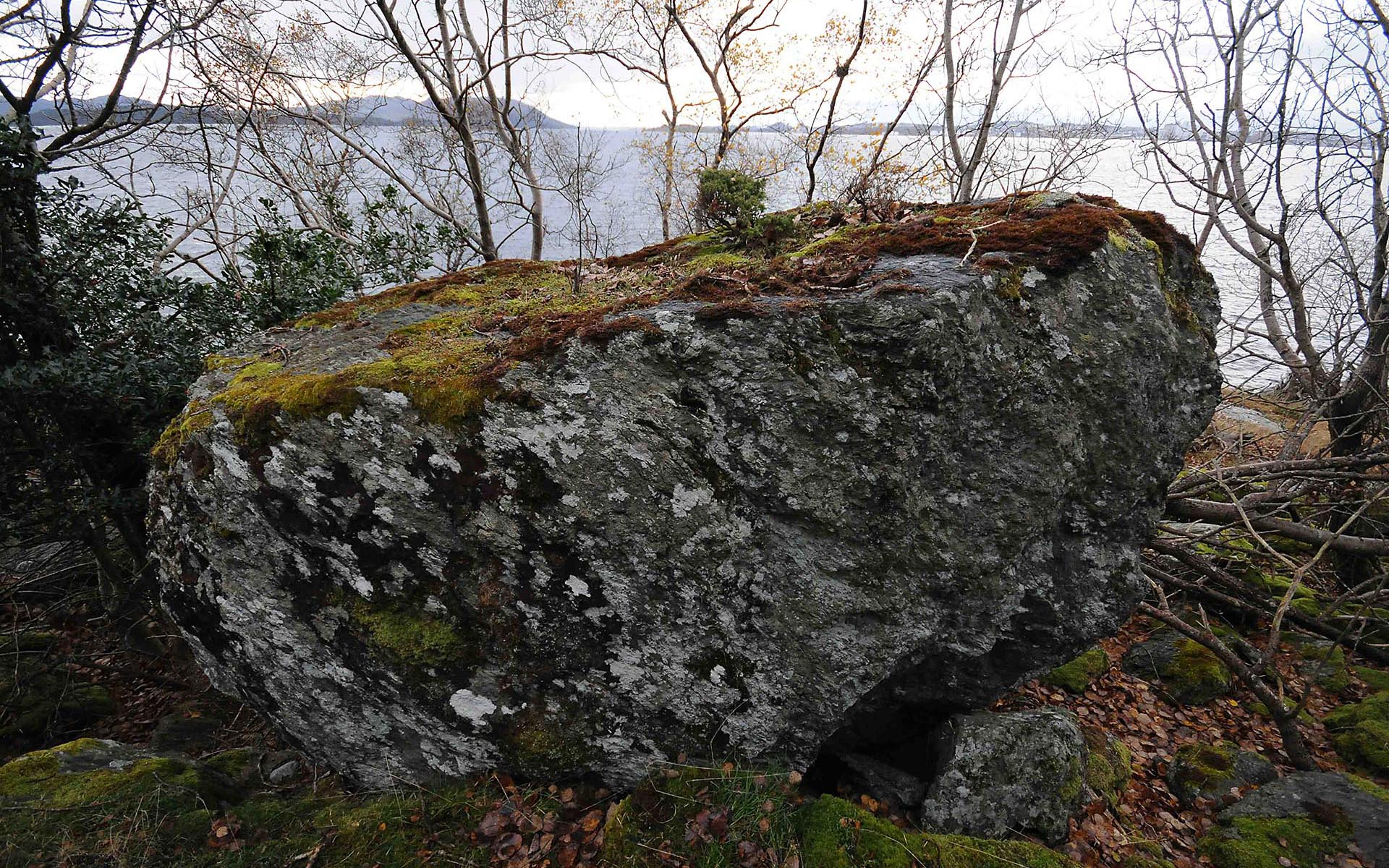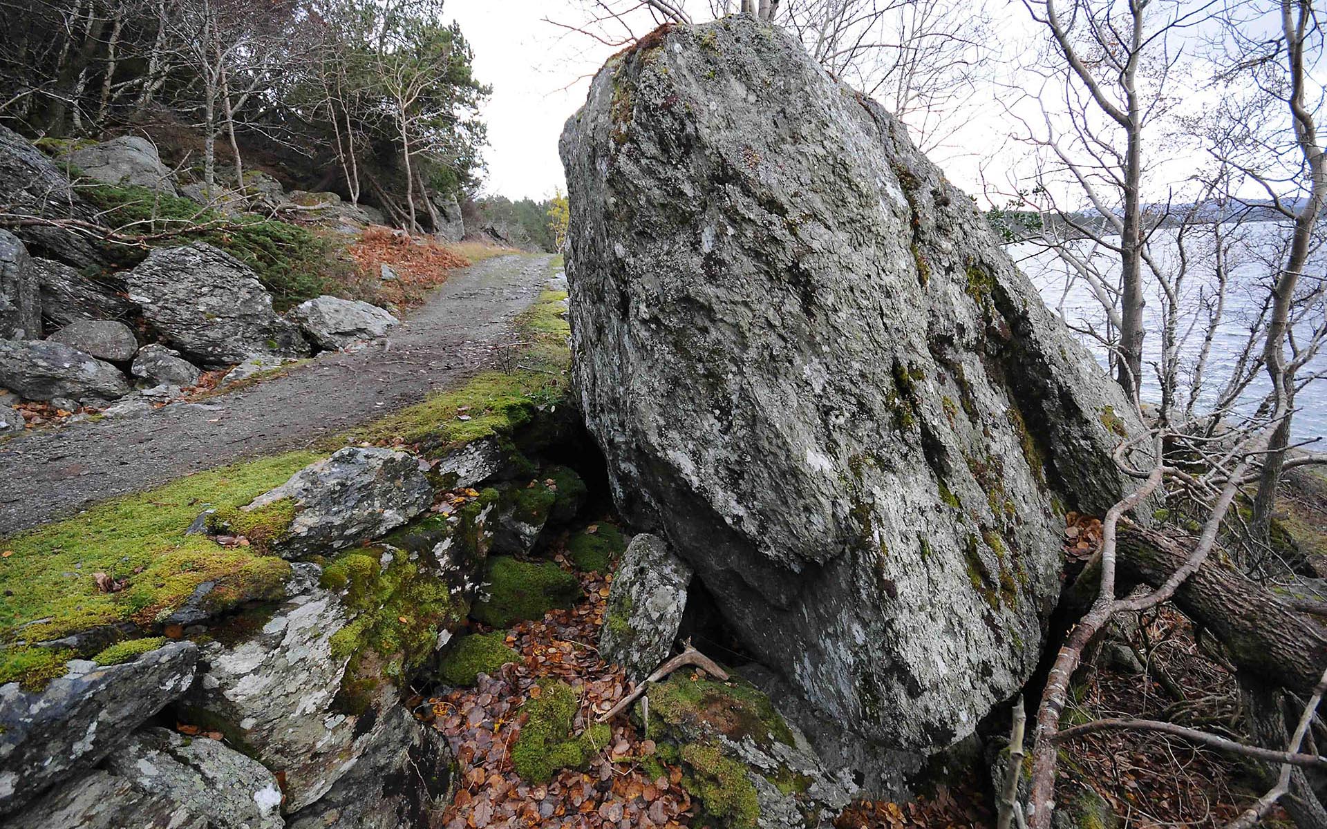 Sted: Stein på høykant som hviler mot den steinlødde turvegen. Vestsiden.