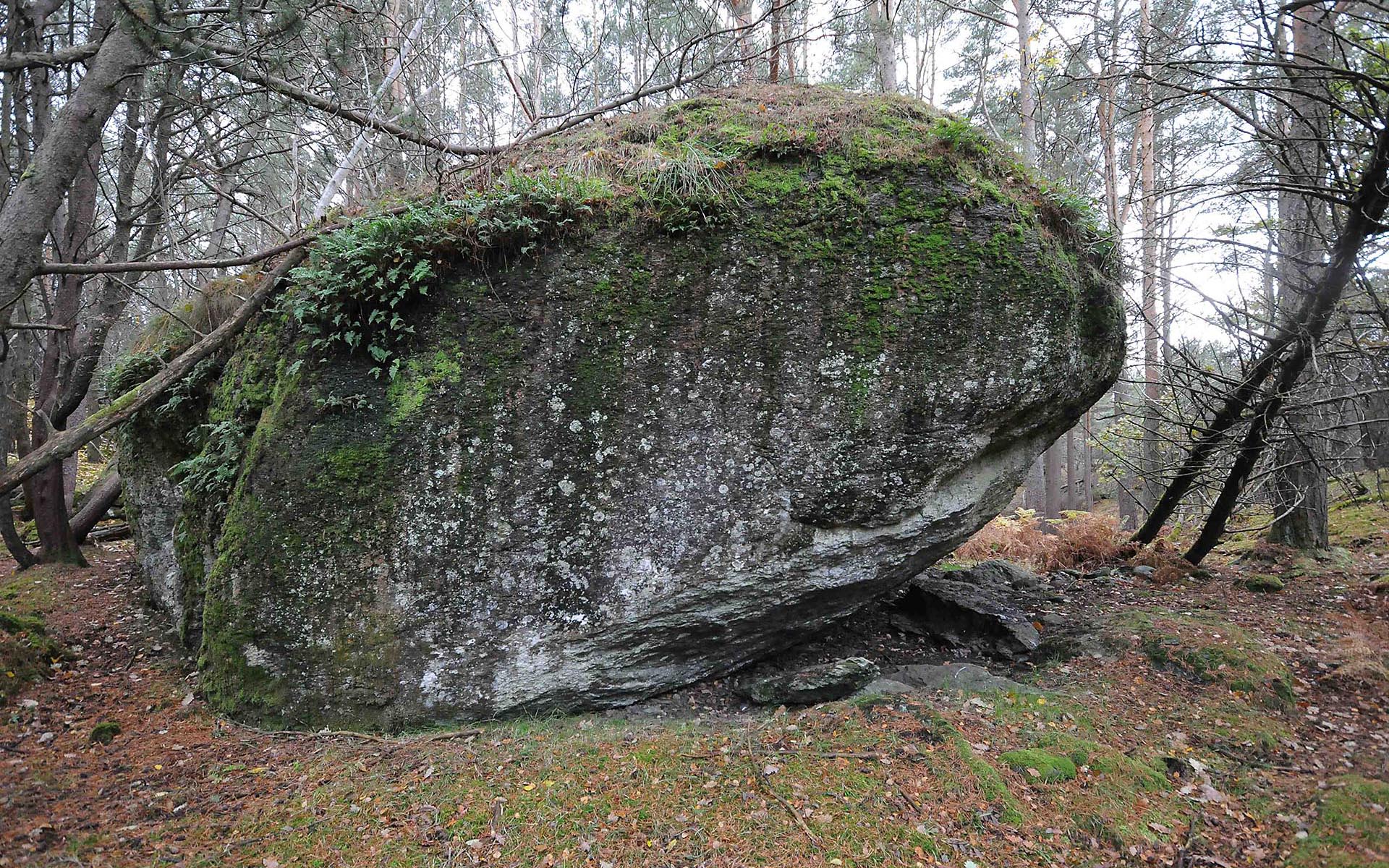 Dronningsteinen ligger i furuskogen midt mellom sjøen og Dammen.