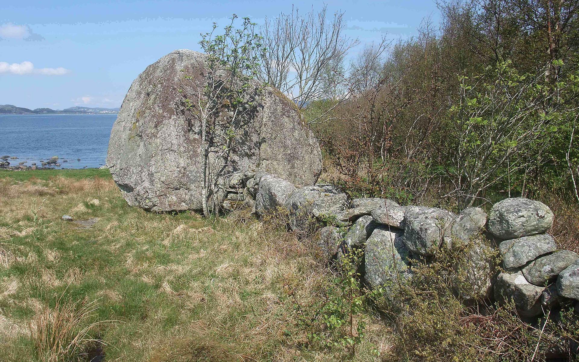 Sted: Stor stein som inngår i et steingjerde nord–sør 30 meter fra turvegen.