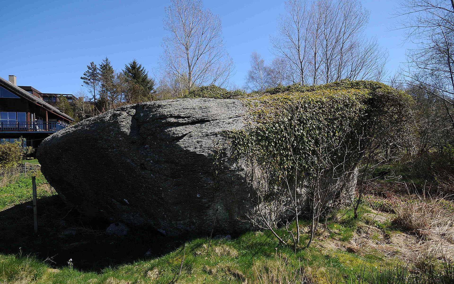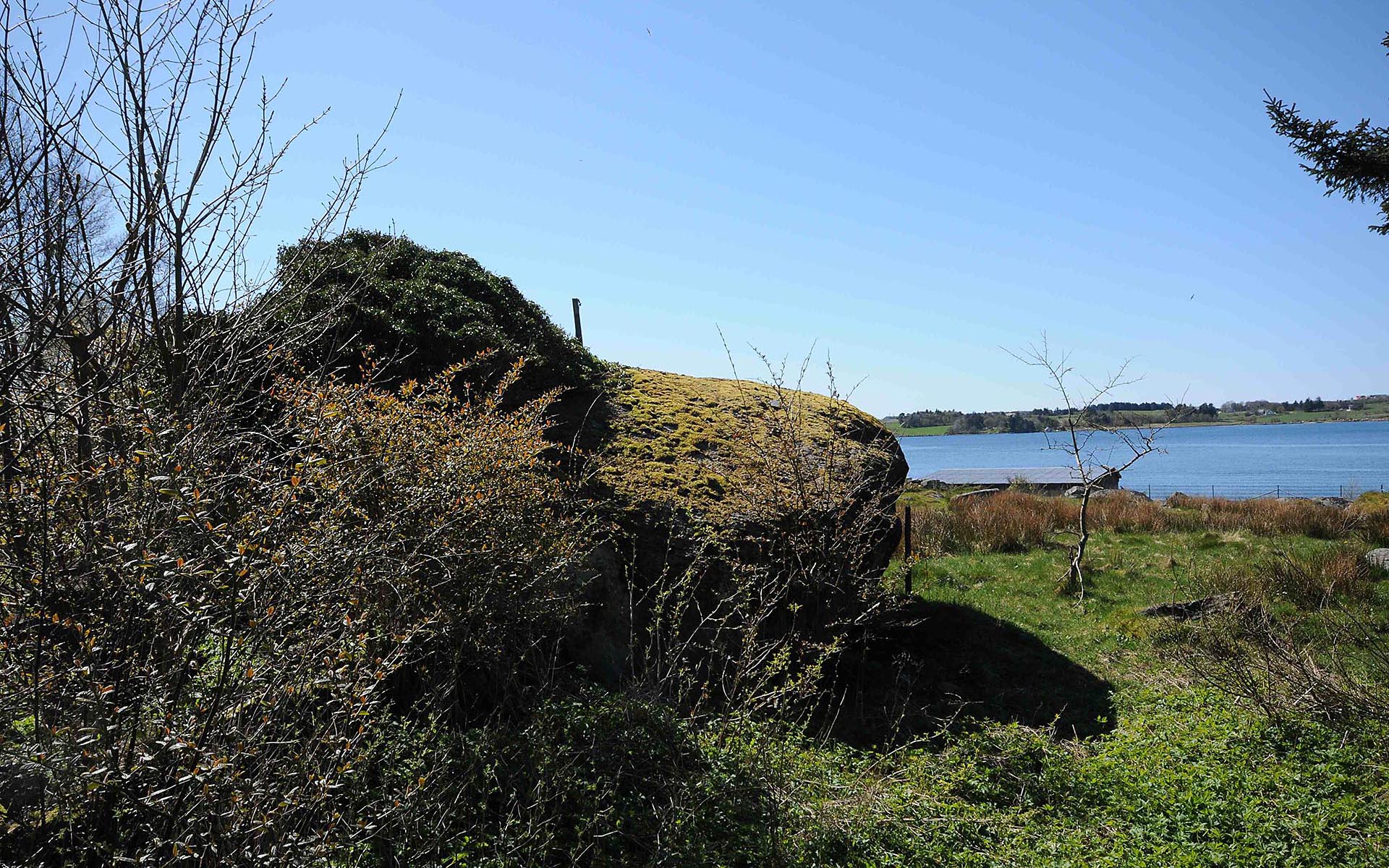 Beskrivelse: “Kamuflert” steinblokk på gjengrodd beitemark.