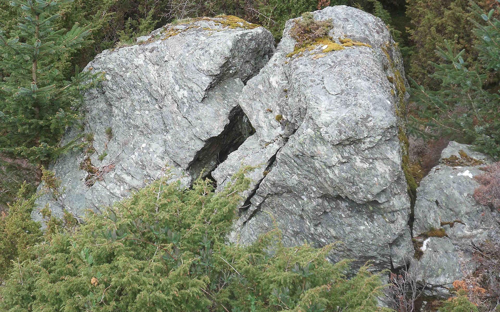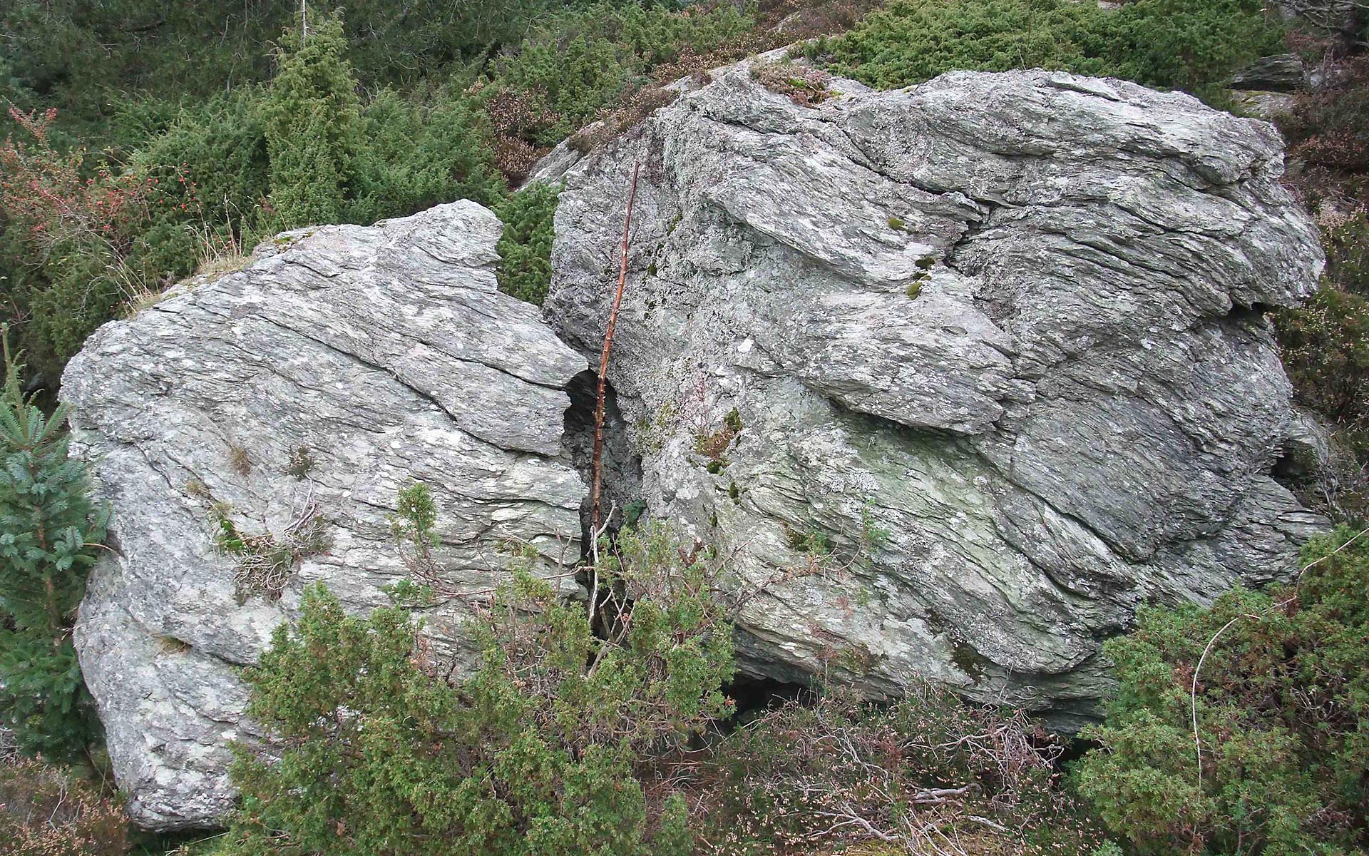 Særtrekk: Markert kløft mellom blokkene. Den minste blokka er ca 2 m x ca 8 m.