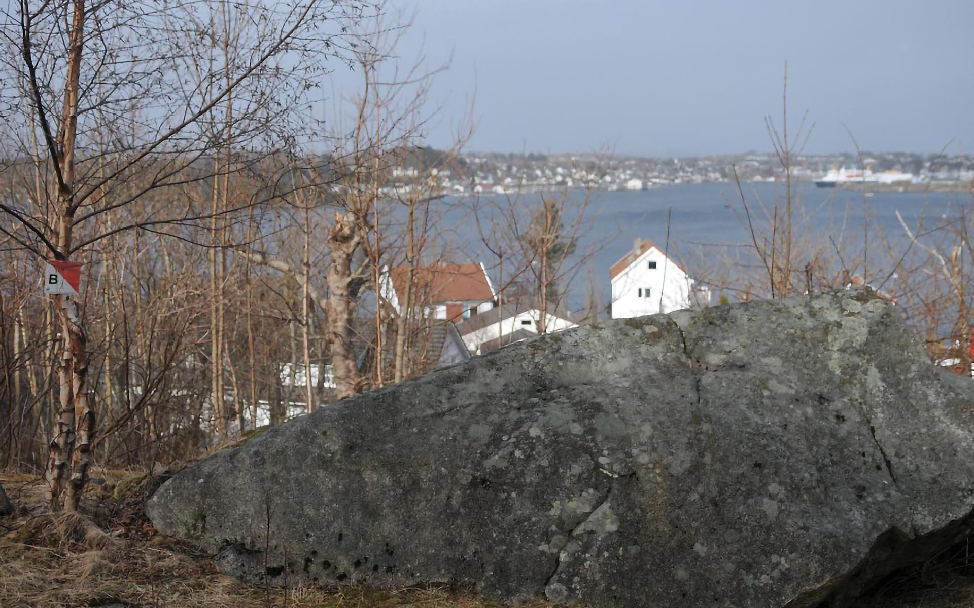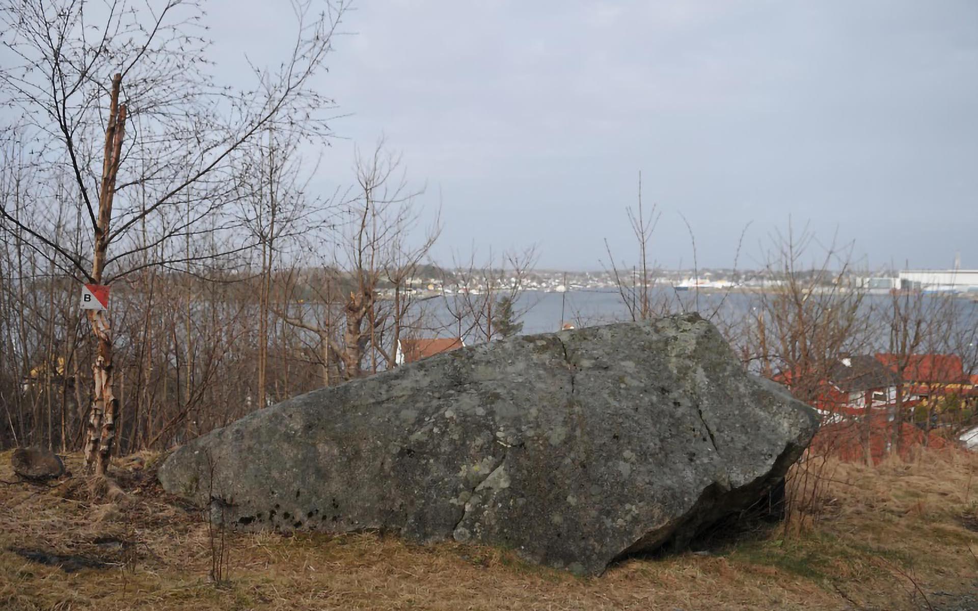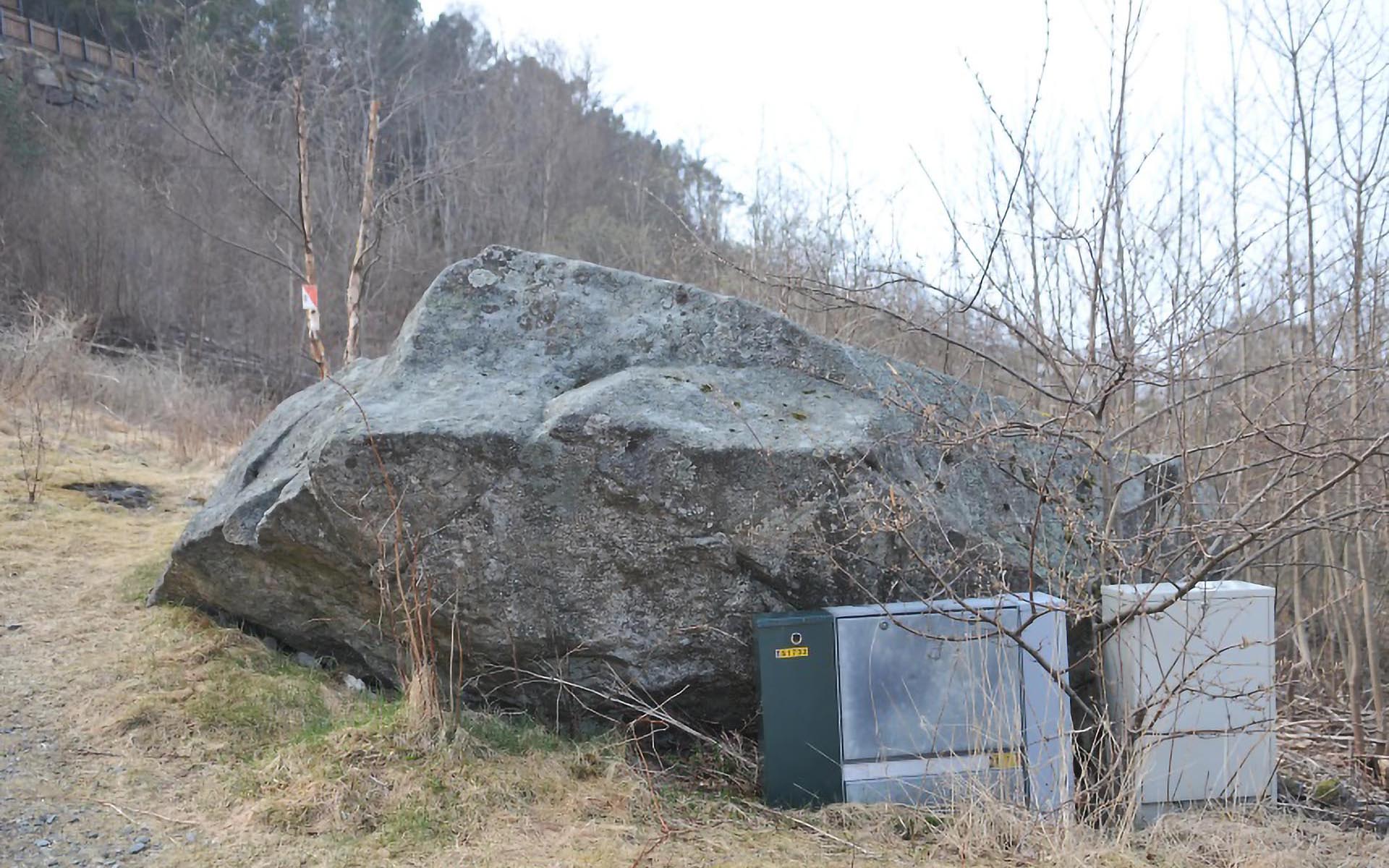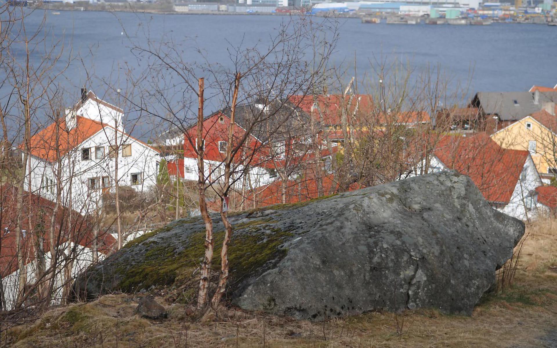 Sted: Steinen ligger like nord for bebyggelsen i Norheimssvingen i Tasta bydel.