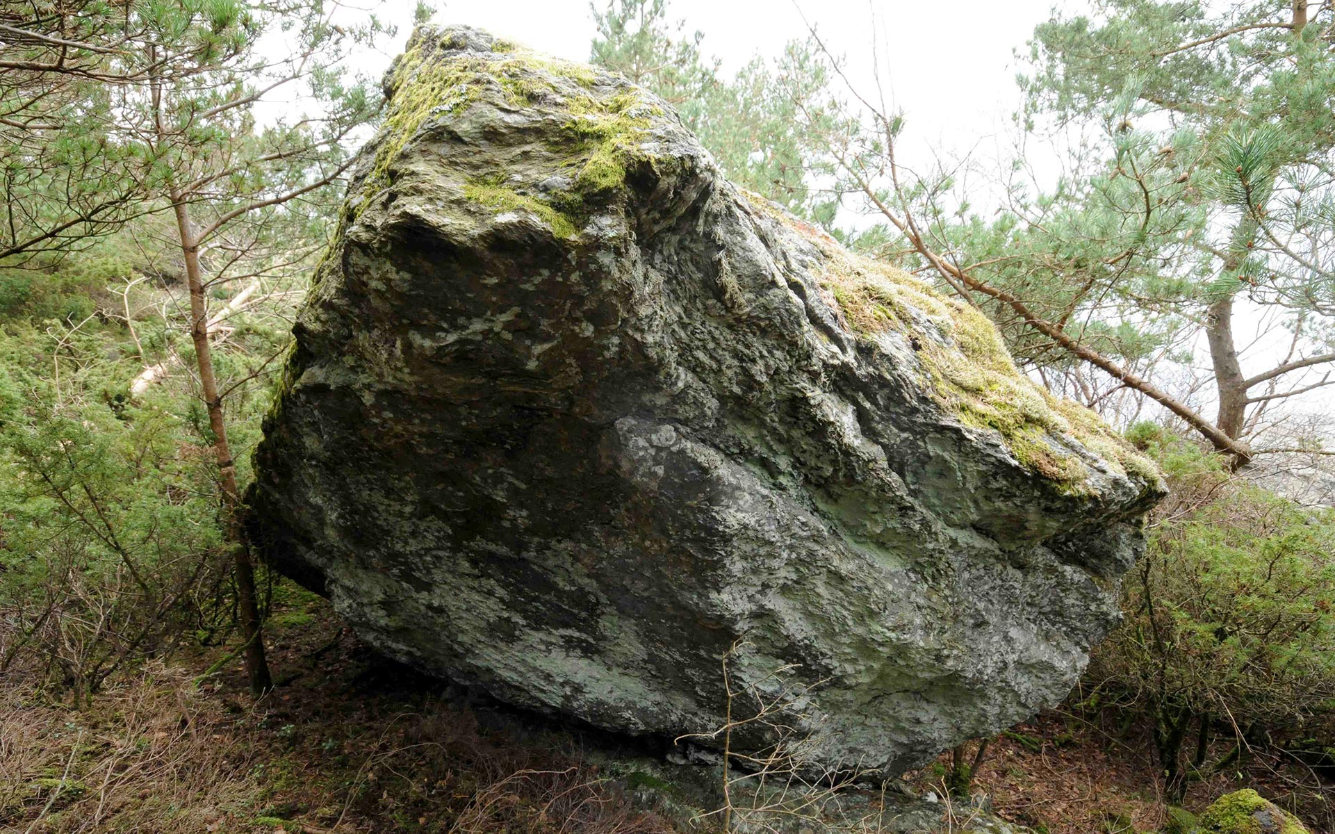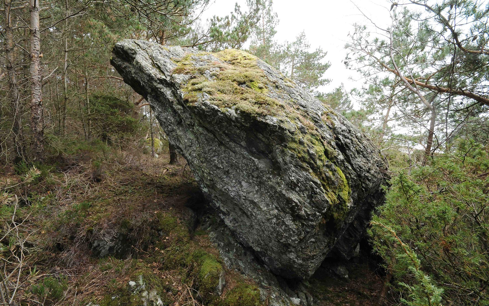 Stein i tett furuskog på vestsiden av Tyttebærholmen, Storhaug bydel.