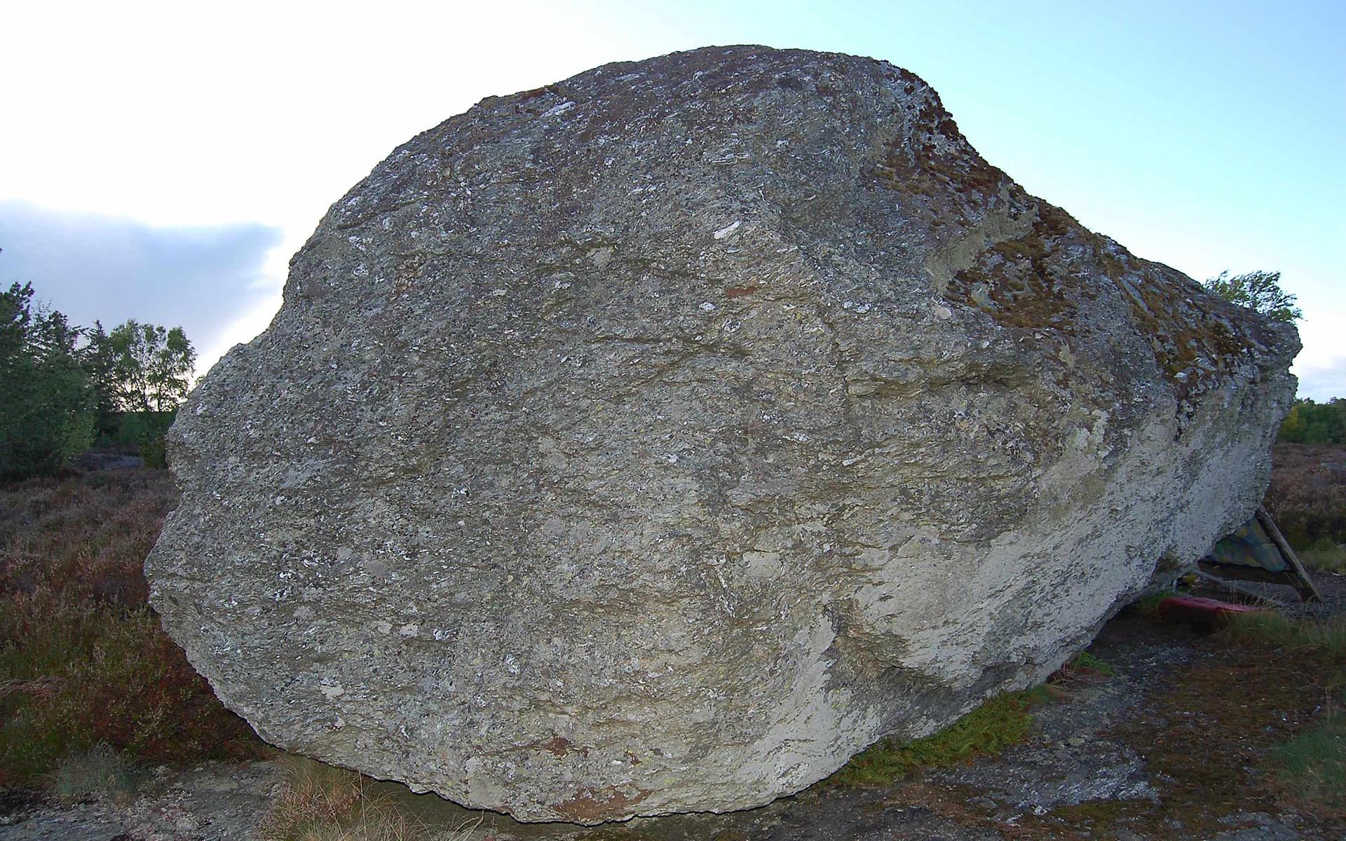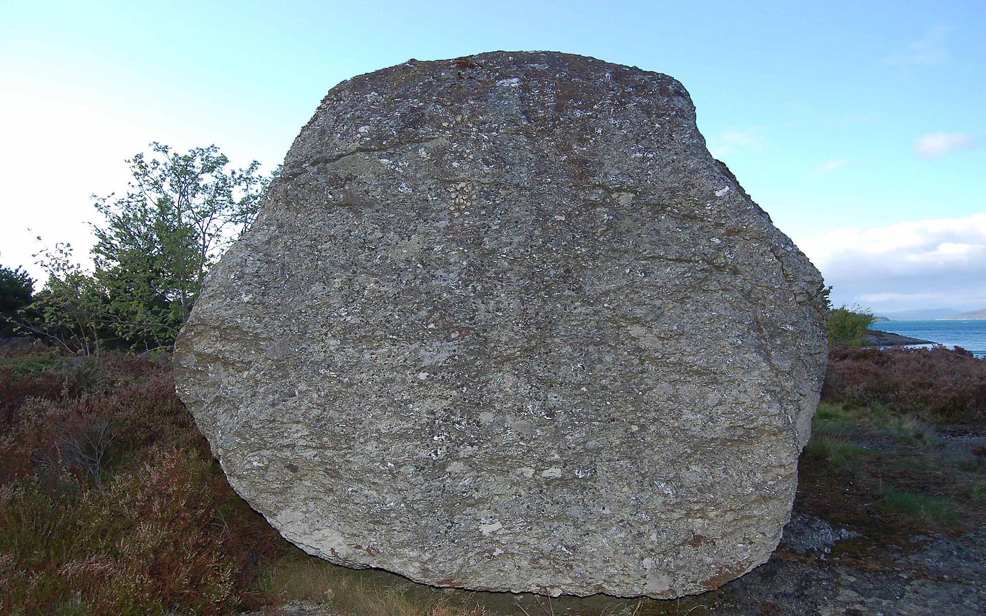 Sted: Blokken ligger åpent i lynghei, mellom bebyggelse og sjøen.