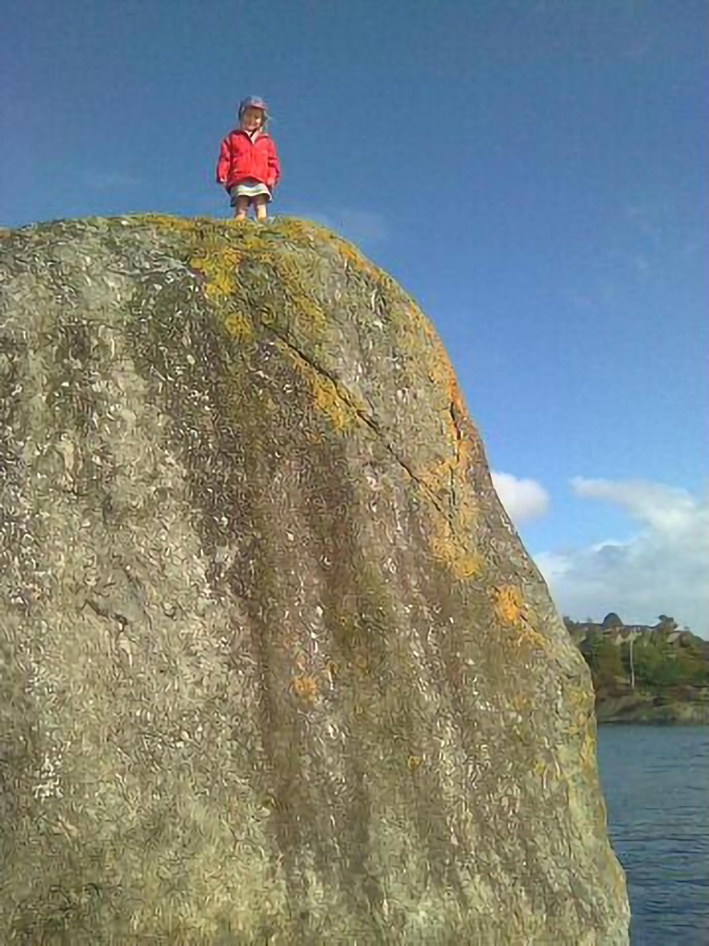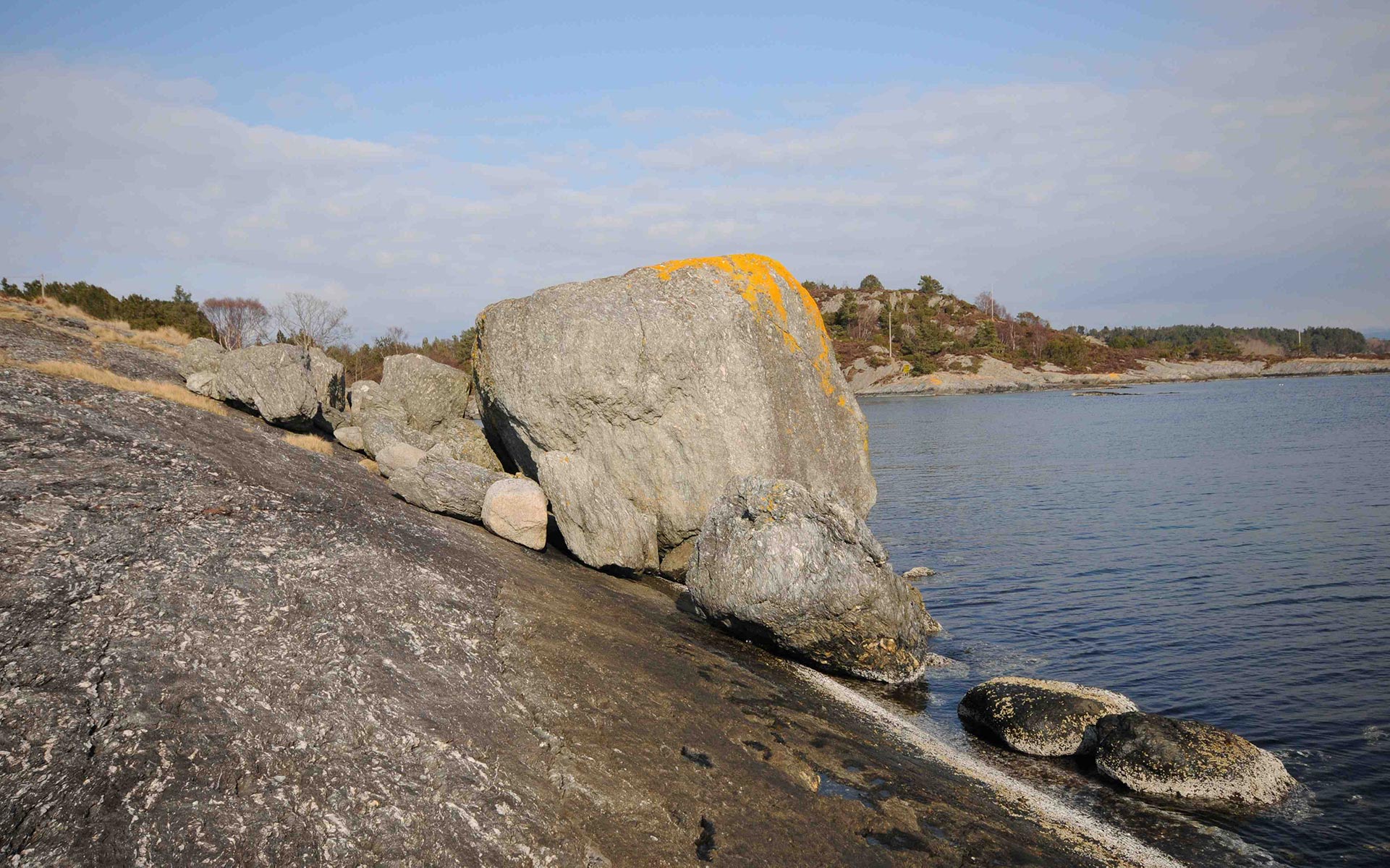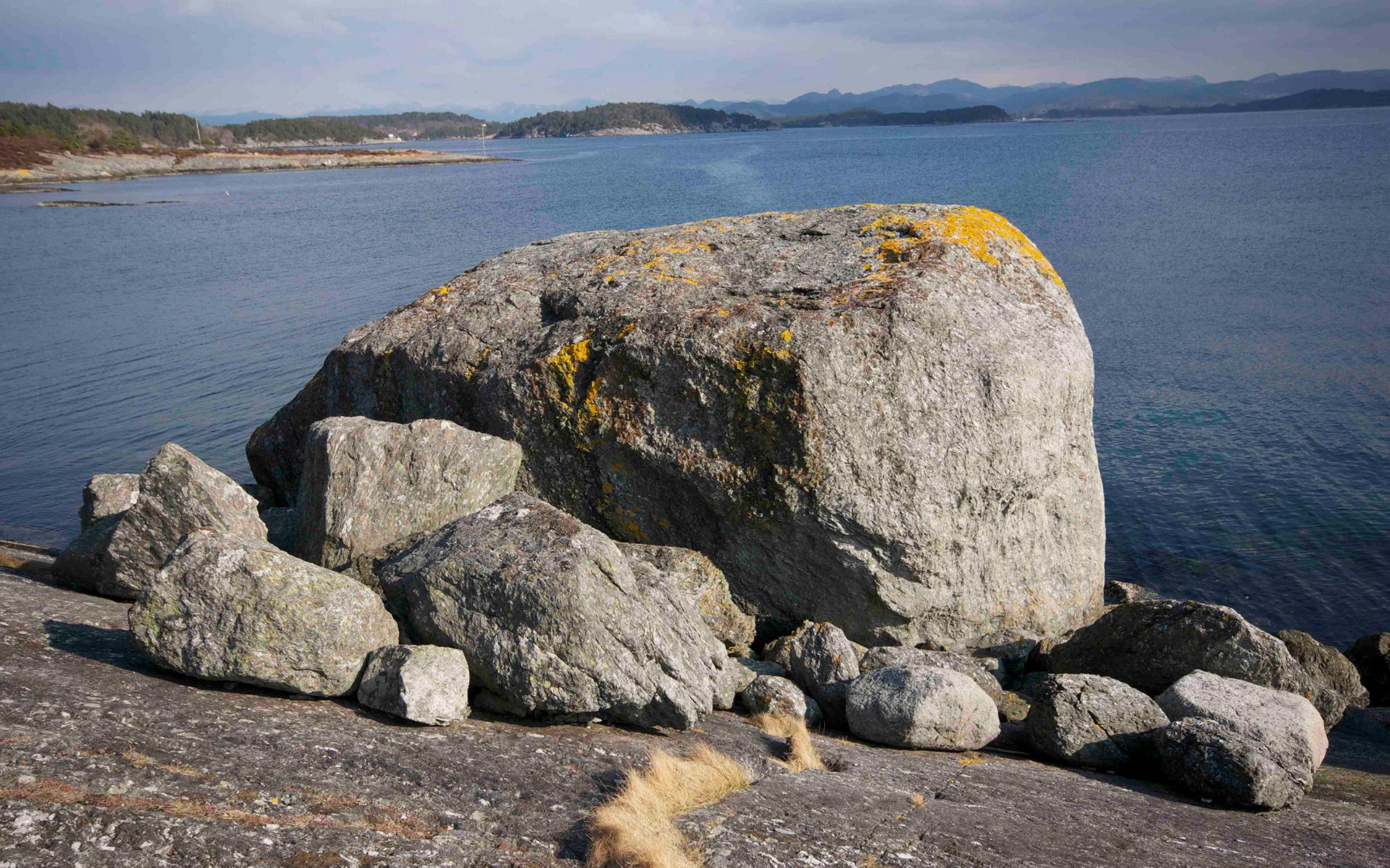 Særtrekk: Steinen ligger på et bratt svaberg, omgittt av flere mindre steiner. Steiner på baksiden gjør det enkelt å trø opp kampesteinen som er flat på toppen. Det lokale navnet ”Smørstykket” (kilde Rune Larsen, Vassøy) kommer av den gule messinglaven som dekker store deler av steinen.